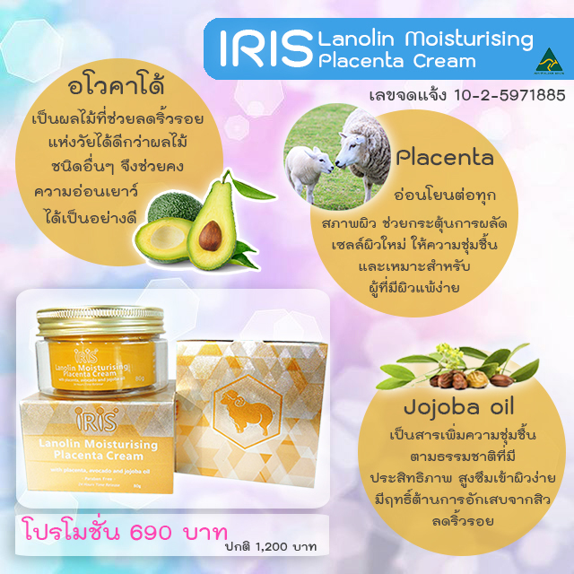 มีส่วนผสมของ Sheep Placenta Extract , Lanolin , Sunflower Oil , Jojoba oil , Avocado Extract , Vitamin E Acetate